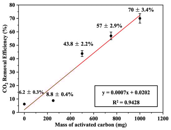 The effect of the mass of activated carbon (mg) per filter unit area (cm2) was tested. Four Nomex filters, each with a diameter of 10 cm, were loaded with 250, 500, 750, and 1000 mg of activated carbon (corresponding to 0.72, 1.44, 2.17, and 2.89 mg/cm2 of carbon per fabric area, respectively) and used for CO2 filtration. The emission removal efficiencies were 8.8 ± 0.4%, 43.8 ± 2.2%, 57 ± 2.9%, and 70 ± 3.4%, respectively, based on triplicate measurements (n = 3), as shown in Figure 8. This improvement in efficiency is attributed to the increased specific filtration surface area (SFSA) of the adsorbing material, which enhances the filtration efficiency.