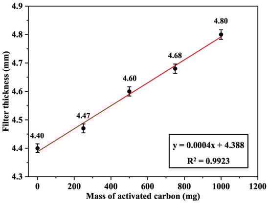 Figure 9. Filter thickness as a function of the loaded mass of activated carbon (AC) (n = 3, error bars represent standard deviation).