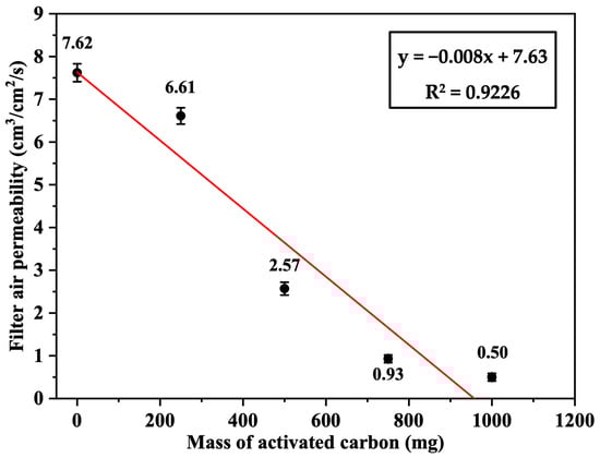 The air permeability of the Nomex sandwich filters loaded with 0, 250, 500, 750, and 1000 mg of activated carbon per filter was measured and found to be 7.62 ± 0.21, 6.61 ± 0.19, 2.57 ± 0.15, 0.93 ± 0.09, and 0.50 ± 0.08 cm3/cm2/s, respectively, based on triplicate measurements (n = 3). As shown in Figure 10, this demonstrated a linear decrease in filter air permeability as the mass of activated carbon increased. The negative correlation was high (R2 = 0.9226) and probably attributed to the high density of carbon, which reduced the airflow across the filter fabric.