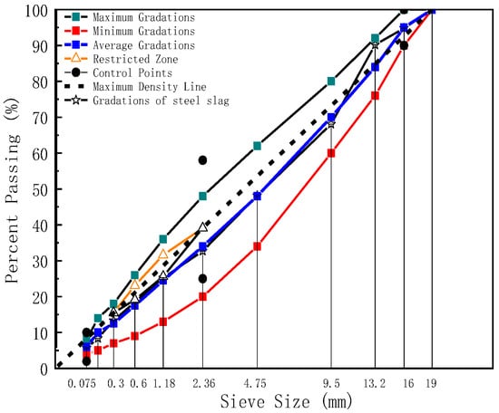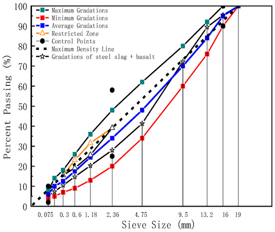 Dense graded (AC-16) was utilized in the following text. In the design process of aggregate blend percentages, one type of aggregate skeleton consists of steel slag aggregate only; the other type consists of steel slag aggregate and basalt aggregate together, in which the steel slag portion consists of three grades of 3–5 mm, 5–10 mm, and 10–20 mm, and the basalt part only includes 0~3 mm. Moreover, for any grade of aggregate in the four specifications, three repeated sieving experiments were tested to reduce the error, the range of gradation was given and the synthetic gradation was controlled using the planning solving method. Table 4 shows different aggregate stockpiles blended by the percentages, and Figure 1 and Figure 2 show the gradation of the steel slag aggregates and steel slag & basalt aggregates.