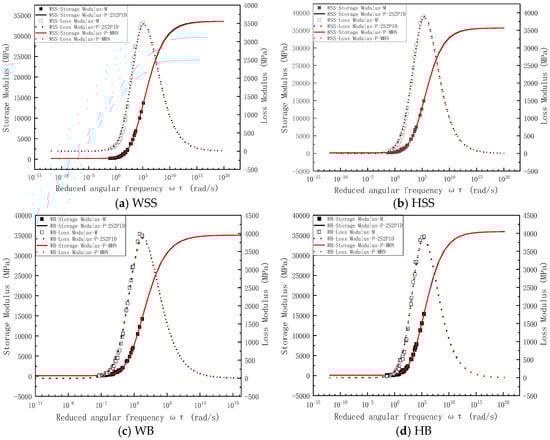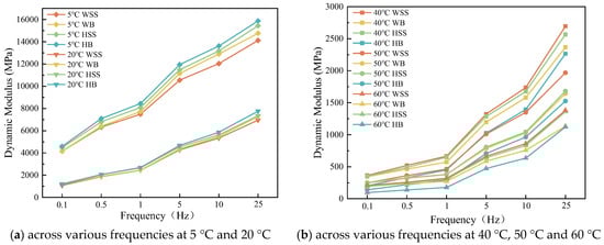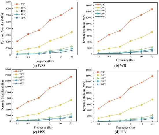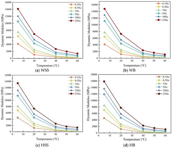 The complex modulus of four steel slag asphalt mixtures (WSS, WB, HSS, and HB) was experimentally characterized under the test conditions specified in Section 2.2.3. The effect of temperature on dynamic modulus is shown in Figure 3.