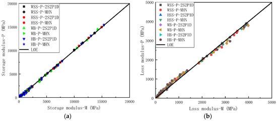 where: is the error function of storage modulus and loss modulus, %; is the error function of storage modulus, %; is the error function of loss modulus, %; N is the test sample point of storage modulus, which has the value of 30; is the sample point of measured storage modulus, MPa; is the sample point of storage modulus predicted from the 2S2P1D model, MPa; is the sample point of measured loss modulus, MPa; is the sample point of predicted from the 2S2P1D model, MPa.