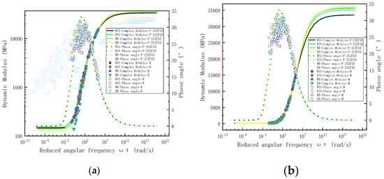 Figure 4 demonstrate that under isothermal conditions, the dynamic modulus of all steel slag-crumb rubber modified asphalt mixtures exhibits loading frequency-dependent enhancement, this is because at lower loading frequency polymeric chains within the binder undergo large-scale motions (such as molecular chain untangling, slip), resulting in viscous flow dominance and loss modulus dissipation []. With the increase of the loading frequency, the polymeric chains motion is gradually restricted, and when the loading frequency increases to certain degree allowing only small-scale local motion (e.g., bond angle vibration, side-base rotation), the material exhibits elastic response with significant enhancement of storage modulus, which is manifested as significant increase of the modulus. In addition, it can also be found that the dynamic modulus of asphalt mixtures is linearly and positively correlated with the loading frequency at the test temperatures of 5 °C and 20 °C, while the dynamic modulus of the four steel slag rubber powder modified asphalt mixtures is nonlinearly and positively correlated with the loading frequency at 40 °C, 50 °C, and 60 °C; in other words, the growth rate of the dynamic modulus increases with the increase of the loading frequency, which is attributed to the fact that the dynamic modulus is dependent on both the temperature and frequency.