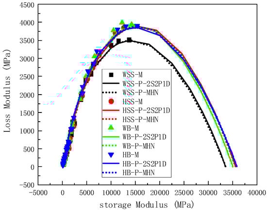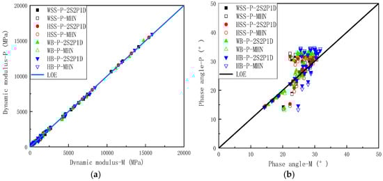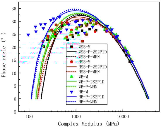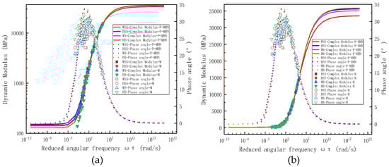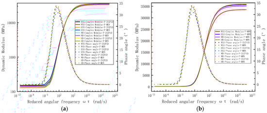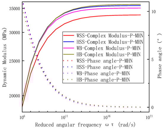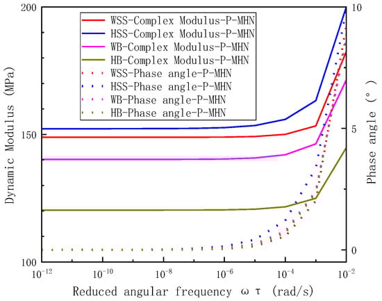 Similar to the previous results for the 2S2P1D model, the dynamic modulus and phase angle results expressed in terms of the MHN model can be obtained by combining the results of the storage modulus and loss modulus, where the dynamic modulus results are shown in Equation (26) and the phase angle results are shown in Equation (27).