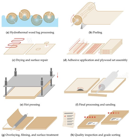 Plywood production (shown in Figure 1) includes the following eight basic stages: (Figure 1a) hydrothermal wood log processing; (Figure 1b) peeling; (Figure 1c) drying and surface repair; (Figure 1d) adhesive application and plywood set assembly; (Figure 1e) hot pressing; (Figure 1f) final processing and sanding; (Figure 1g) overlaying, filming, and surface treatment; and (Figure 1h) quality inspection and grade sorting. Flame retardants can be added after plywood production (immersion impregnation) or before the formulation of sets (impregnation of veneers and re-drying). Plywood has a wide range of applications in construction. Examples of applications include formwork, prefabrication, scaffolding platforms, technical floors, roofs, modular homes, mobile homes, wall cladding, and stage platforms [2].