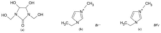 Chemical structures of (a) DMDHEU, (b) 1-ethyl-3-methylimidazolium bromide, and (c) 1-ethyl-3-methylimidazolium tetrafluoroborate.