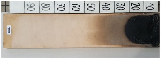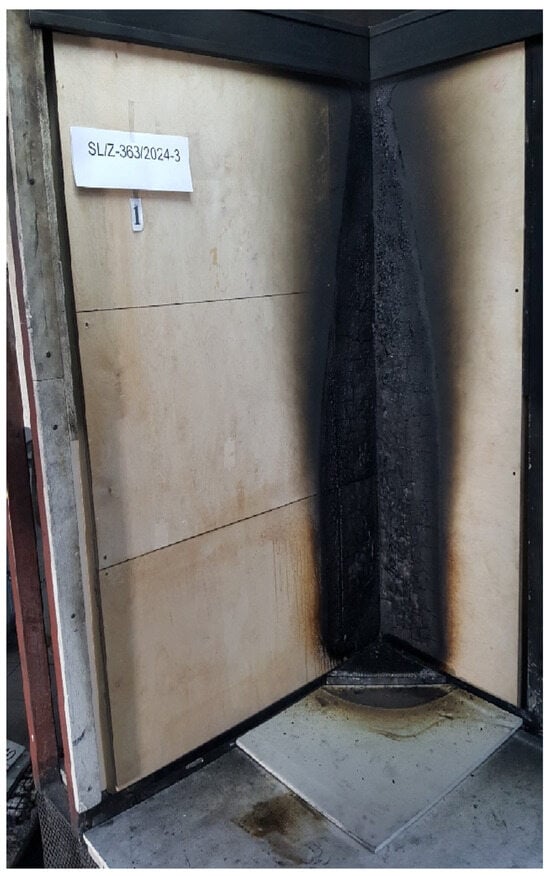 The above standard details the conformity assessment and the requirements for marking these products. The document covers wood-based panels in the form of solid wood panels, LVL, plywood, OSB panels, resin- or cement-bonded particleboards, wet-processed fiberboards (hard-, medium-, and softboards), and dry-processed fiberboards (MDF) for use in construction. The above panels may contain chemicals that improve their reaction to fire and resistance to biological attacks, such as from fungi and insects. The standard also refers to other standards that plywood should fulfil, such as EN 636:2005 [43] and EN 314-2:2001 [44]. According to the above, the required minimum fire reaction class for plywood in accordance with EN 13501-1:2019-02 [45] is Ds2d0, where D means that the flammability with a small flame for 60 s meets the criterion Fs < 150 mm, indicating significant participation in fire; s2 indicates medium smoke emission; and d0 indicates there are no burning droplets. However, requirements can be individual, and very often investors require class Bs1d0 in the case of walls and ceilings or Bfls1 in the case of floors, where B means that the flammability with a small flame for 60 s meets the criterion Fs < 150 mm, indicating limited participation in fire. The above markings are made in accordance with the standards EN 13823+A1:2014-12 [46], EN ISO 9239-1:2004 [47], and EN ISO 11925-2:2020-09 [48]. During testing, parameters such as FIGRA [W s-1] (a parameter describing the rate of heat release by the tested material), THR [MJ] (a parameter describing the total heat released), and SMOGRA [m2 s−2] (the smoke release rate index) are determined. Figure 3 and Figure 4 present samples tested in accordance with the above standards.