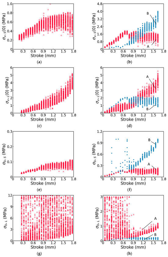 First of all, the spring moduli and for the two viscous branches, as summarized in Figure 9, were calculated using Equations (10) and (11) based on the six fitting parameters in Figure 8. For the pure PC specimen, as shown in Figure 9a, only 10 out of 2400 points have values close to zero. Since this is a very small fraction of the total number of data points, these near-zero values were ignored. After ignoring these 10 values, Figure 9a suggests that the values for the pure PC specimen form a single group at each stroke. On the other hand, for the GF-PC specimen, Figure 9b indicates that the values can be divided into two groups, A and B, with values in the former group ranging from 1 to 30 MPa and those in the latter group being close to zero. The corresponding fitting parameter values in Figure 8 that were used to determine the two groups of values were then also labeled as A and B.