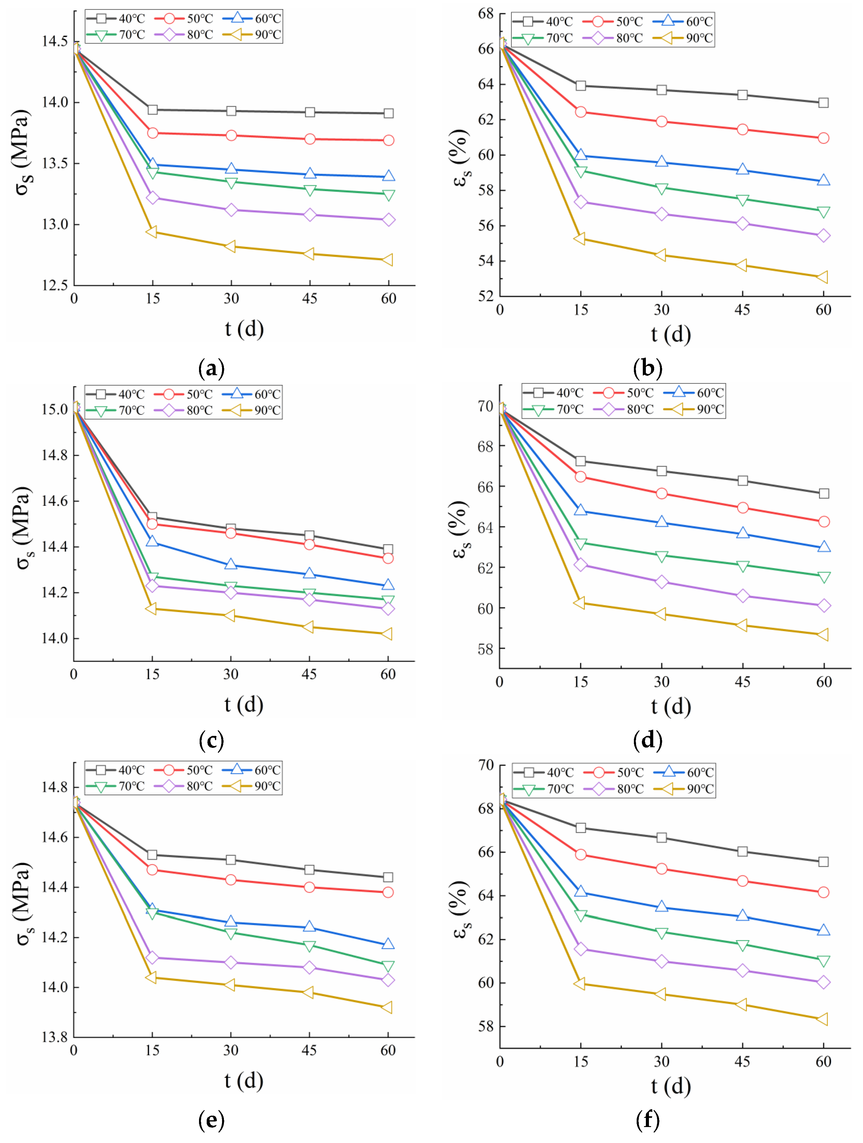 Figure 5 illustrates the variation in yield strain and stress over time at different temperatures for the three PVC-P GMBs. The results demonstrated that both yield strain and yield stress exhibited a decreasing trend as test temperature and duration increased, indicating a degradation of mechanical properties under high-temperature water exposure. After being immersed in water at 40 °C for 15 days, the yield stress of Material A decreased from 14.44 to 13.94 MPa (a reduction of 3.46%), and the yield strain decreased from 66.31% to 63.92% (a reduction of 3.6%). By 60 days, the yield stress further decreased to 13.91 MPa, and the yield strain to 62.96%, with both parameters showing a reduction of less than 2%. At 90 °C, within the same 15-day period, the yield stress and yield strain of Material A decreased by 10.39% and 16.65%, respectively, which were significantly higher reductions compared to those observed at 40 °C. This indicates that elevated temperatures accelerate the degradation of mechanical properties. For Material B, at 40 °C, the yield stress and yield strain decreased by 3.2% and 3.71% over the initial 15 days, and by 0.96% and 2.38% over the subsequent 45 days (up to 60 days). For Material C, the corresponding decreases were 1.4% and 1.9% over the initial 15 days, and 0.62% and 2.32% over the next 45 days. Within the initial 15 days, there was a significant reduction in yield strain and stress, followed by a period of slower decline. This behavior suggests that the PVC-P GMBs were initially highly sensitive to the water environment, but their rate of performance degradation diminished as they gradually adapted to the conditions over time.