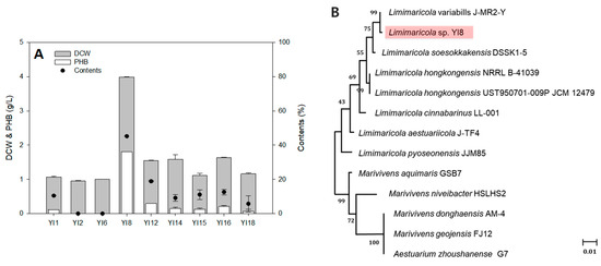 Screening the novel polyhydroxybutyrate P(3HB)-producing strain Limimaricola sp. YI8. (A) Screening P(3HB)-producing microbes from the marine environment. Limimaricola sp. YI8 produced 1.8 g/L of P(3HB) with 4 g/L dry cell weight (DCW). (B) Phylogenetic tree of Limimaricola sp. YI8.