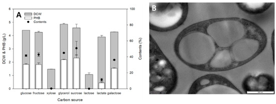 Carbon source test. (A) Optimization of carbon source. Cultivation was performed in 14 mL test tubes containing 5 mL of marine broth (MB) medium supplemented with 1% (w/v) of each sugar. After 1% (v/v) inoculation, the cultures were incubated at 30 °C and 200 rpm for 3 days. The highest P(3HB) production (2.31 g/L) was observed with sucrose as a carbon source. (B) Transmission electron microscopy image of Limimaricola sp. YI8.