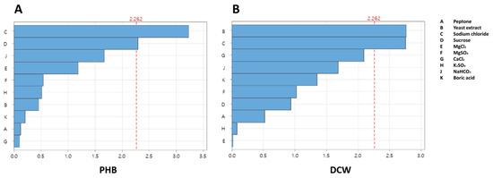Pareto chart of the 10-factor standard effects on poly(3-hydroxybutyrate) and dry cell weight (DCW) production. (A) Pareto chart for P(3HB) production. (B) Pareto chart for DCW.
