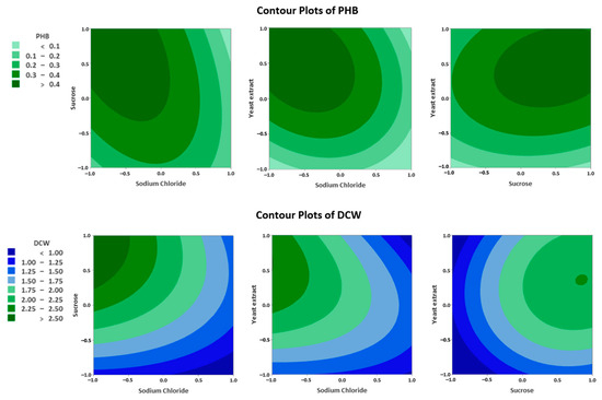 Minitab 21 (Minitab Inc., State College, PA, USA) was used for the experimental design and subsequent regression analysis of the experimental data. Significant differences were determined using analysis of variance. The quality of the polynomial model equation was judged statistically using the coefficient of determination R2, and its statistical significance was determined using an F-test. The significance of regression coefficients was tested using t-tests. In this case, yeast extract, sodium chloride, and sucrose significantly affected P(3HB) yield (p < 0.05).