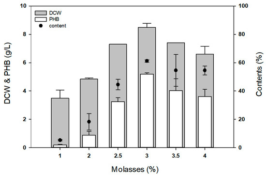 When Limimaricola sp. YI8 was cultured in 5 mL MB medium with molasses as the carbon source at different concentrations (1, 2, 2.5, 3, 3.5, and 4%), the maximum biomass and P(3HB) production were achieved at 3% (sucrose 11.65 g/L), yielding 8.5 g/L of DCW and 5.2 g/L of P(3HB) production. When using molasses instead of sucrose as a carbon source, both cell mass and P(3HB) content increased significantly compared to when sucrose was used. Considering the manufacturing cost and complexity associated with genetic engineering to improve P(3HB)-producing strains, this result indicates a positive impact for P(3HB) production using Limimaricola sp. YI8.