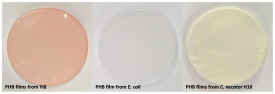 A visual comparison of the P(3HB) films obtained from each strain is depicted in Figure 6. The P(3HB) film from Limimaricola sp. YI8 showed a distinct pinkish color, which could aid visualization. In a previous report, Limimaricola hongkongensis and Limimaricola variabilis also formed pinkish colonies, considered a result of carotenoid pigments [14]. The pigments protect cells from direct sunlight, thereby safeguarding the bacterial culture from damage caused by ultraviolet light exposure [35]. In contrast, P(3HB) films obtained from Escherichia coli and Cupriavidus necator were colorless and yellowish, respectively.
