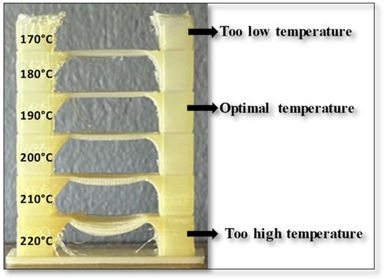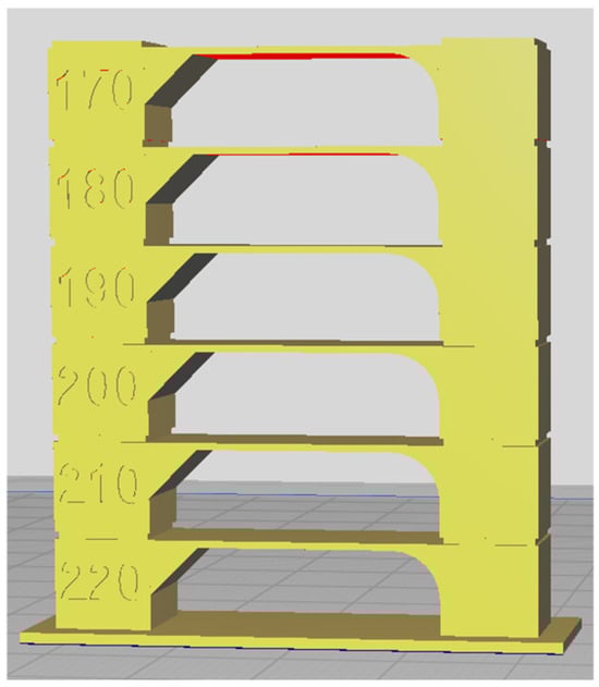 The temperature tower consists of multiple levels, with each level printed at a different temperature. The first level was printed at 220 °C, and each subsequent level was printed at a temperature 10 °C lower until a printing temperature of 170 °C was reached. The quality of each level was visually inspected, and the optimal printing temperature for the polymer blend was determined based on the best-performing level. The design of the temperature tower is shown in Figure 1.