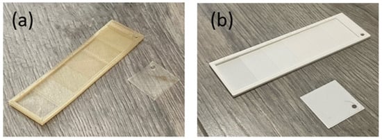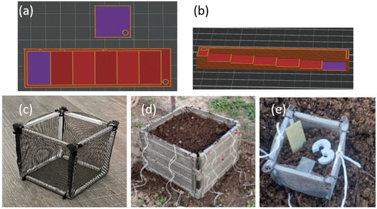 The compostability test was conducted under real conditions using a home compost system, specially designed with varying wall thicknesses (increasing from 0.2 mm to 1.2 mm), and a sample with a thickness of 0.2 mm in a square shape was 3D printed from selected polymer blends as well as from standard PLA for reference (the slicer models of the 3 printed specimens are shown in Figure 3a,b.