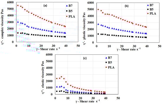 The heat flow dependency on temperature was recorded as the output of the measurement. All investigated thermal parameters were analyzed using DSC curves and processed with the SW STARe 16.40 evaluation software (Mettler-Toledo Inc.). Flow curves for all samples were recorded at 160 °C. Complex viscosity as well as the plastic and elastic parts of viscosity were evaluated for all 13 blends and the PLA standard.
