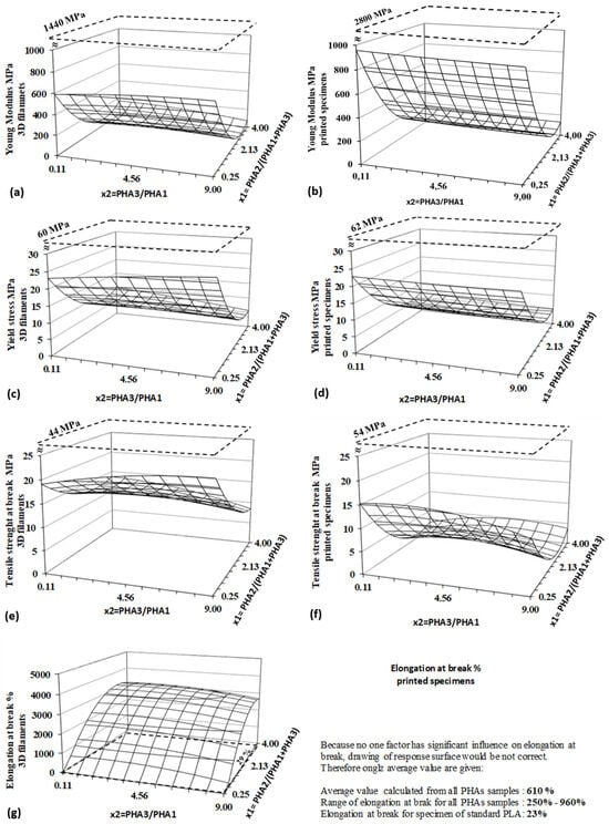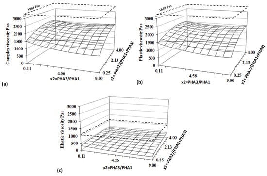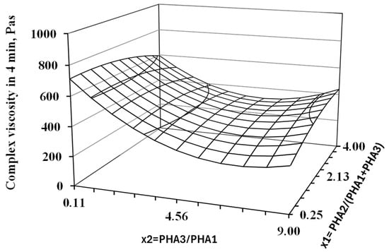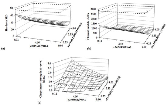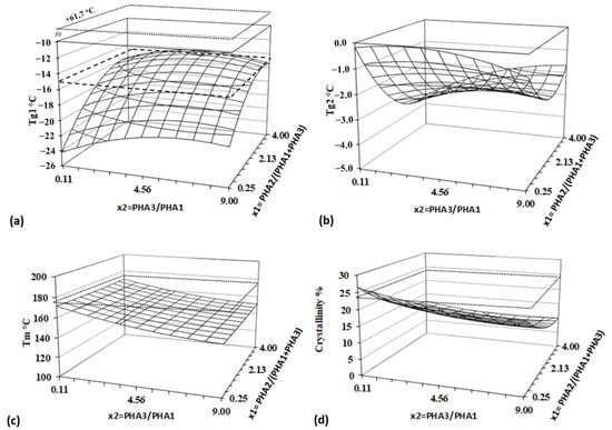 The first factor (x1) was the PHA2-to-(PHA1 + PHA3) mass ratio (PHA2/(PHA1 + PHA3)), and second factor of the experiment (x2) was the PHA3-to-PHA1 mass ratio. Table 1 presents the encoded values of both factors based on their actual real values, and Table 2 presents the composition in encoded values of all prepared blends. The limit values in coded levels −1.141 and 1.141 correspond with the limit composition of the samples, while the mean value is located at the coded coordinate 0. The confidence interval for the evaluation of results was 95%.