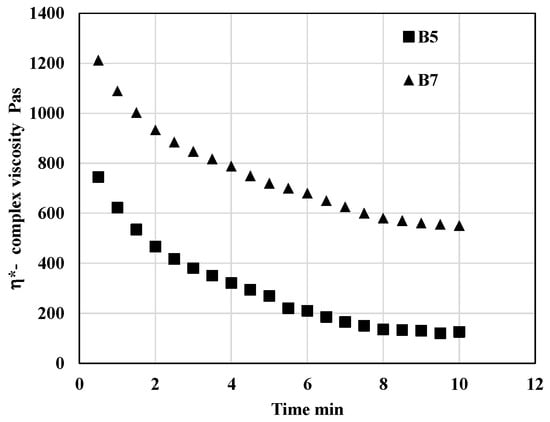Rheological analysis was additionally employed to assess the processing stability of the polymer blends. To this end, the complex viscosity of each sample was measured following a controlled thermo-mechanical loading procedure using an oscillatory rheometer. The specimens were introduced into a biconical test chamber, which was subsequently sealed, and the system temperature was adjusted to 200 °C. A static preheating phase of 0.5 min was applied to ensure complete melting of the samples. Thereafter, oscillatory deformation was initiated at a frequency of 50 cycles per minute (CPM) with an oscillation angle of 60°. Under these conditions, the evolution of complex viscosity was monitored over 10 min. The viscosity value recorded at the 4 min mark was a key indicator of processing stability. A lower complex viscosity at this stage was interpreted as indicative of reduced resistance to thermo-mechanical degradation and thus of lower processing stability.