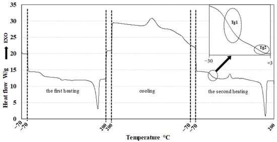 - First heating cycle: −70 °C to +200 °C at a heating rate of 10 K/min;