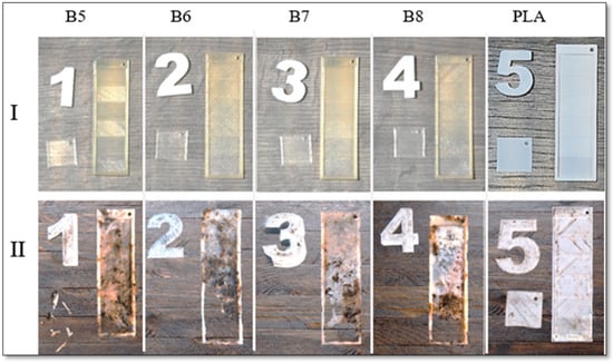 The results depicted in Figure 19 present the degradation trends of the analyzed samples following a two-month home composting period. The SEM images captured at 50× and 500× magnifications reveal substantial decomposition in the PHA-based blends (samples B5–B8), as evidenced by significant material loss from the surface. In contrast, the PLA sample remains largely unaltered, exhibiting no visible signs of degradation under the same conditions. This difference in degradation behavior can be attributed to the intrinsic properties of polyhydroxyalkanoate (PHA) polymers, which are known for their rapid biodegradation in composting environments. PHA polymers are a class of biodegradable materials synthesized by various microorganisms as intracellular energy storage compounds. According to the literature, their microbial origin makes them highly susceptible to enzymatic degradation by a diverse range of bacteria and fungi present in composting systems [,].