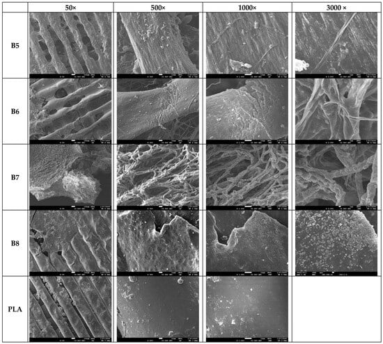 SEM photos of surfaces of samples B5–B8 and PLA after composting (the magnification is given in the first row).