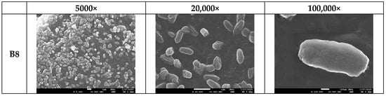 Figure 19 shows that, at higher magnifications (1000× and 3000×), filamentous fungi are observed in small quantities on samples B5 and B6, while sample B7 shows a substantial portion of the surface covered by these fungi, indicating strong microbial adhesion to the sample surfaces. Furthermore, in Figure 20, sample B8, which exhibited substantial degradation, displays numerous bacterial colonies at 1000× to 3000× magnification. Higher magnifications (5000×, 20,000×, and 100,000×) were also examined to confirm the presence of these bacterial colonies.