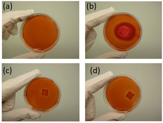 Results of the agar diffusion test for sample B5. (a) Negative control (only cells) (A (0/0), (b) positive control (gauze moistened with SDS) (B (4/4)), (c) sample B5 (C (0/0)), and (d) sample B8 (D (0/0)). The response index (zone/lysis) is indicated in parentheses.
