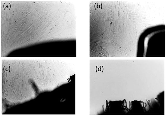 Microscopic images of cells cultivated in the presence of samples B5 (a) and B8 (b), alongside negative ((c)—gauze) and positive ((d)—gauze moistened with SDS) controls, after 72 h of the in vitro contact toxicity test (Magnification 10×).