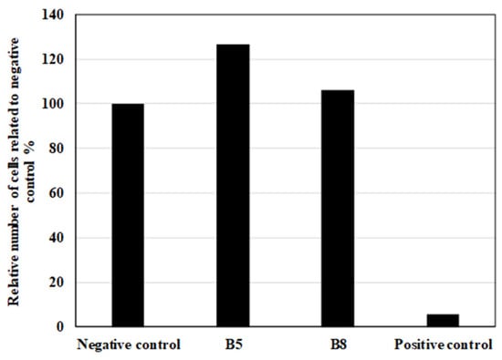 To further assess the biocompatibility of the tested materials, quantitative cell proliferation analysis was conducted by determining the viable cell count after 72 h. As is depicted in Figure 23, the relative cell number was normalized to the negative control, allowing for a comparative assessment. The results indicate that samples B5 and B8 supported fibroblast proliferation at levels comparable to or exceeding those observed in the negative control group. This suggests that the presence of these materials may have a neutral or potentially supportive effect on cellular proliferation.
