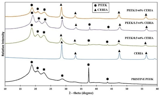 XRD patterns of pristine PEEK and PEEK reinforced with ceria at different loading conditions.