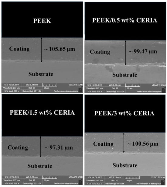 Figure 4 presents the thickness measurements of pristine PEEK and PEEK/ceria nanocomposite coatings. It was noted that incorporating the nanofillers did not significantly change the thickness values. The average value of the thickness readings of the coatings was found to be ~100 ± 5 µm. Figure 5 depicts the EDS elemental maps of cerium (Ce), which offers insights into the distribution of ceria nanoparticles within the PEEK composite coatings at varying weight percentages. At 0.5 wt%, ceria nanoparticles demonstrate a lower concentration of nanofiller throughout the polymer matrix. However, at 1.5 wt%, the overall distribution is relatively uniform, indicating the effective distribution of the ceria nanoparticles within the PEEK polymer matrix. In contrast, at 3 wt%, very pronounced agglomerations of ceria nanoparticles become evident, suggesting non-uniform distribution within the polymer matrix. Various researchers performed such observations underlying the importance of dispersion analysis of the ceria nanoparticle in their studies [48,49].