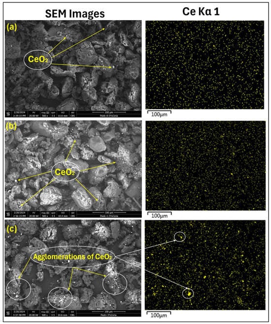 SEM images PEEK matrix reinforced with (a) 0.5 wt%, (b) 1.5 wt%, and (c) 3 wt% ceria loadings, along with EDS maps for cerium (Ce).
