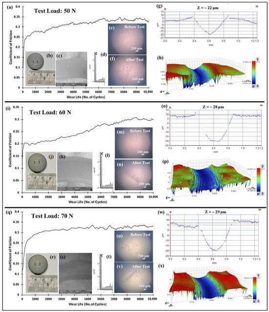 Comparison of the (a,i,q) frictional graph of pristine PEEK coatings, along with (b,j,r) wear track photographs, (c,k,s) SEM images and the corresponding (d,l,t) EDS scans, the (e,m,u) counter face ball images before and (f,n,v) after the test, the (g,o,w) 2D depth, and the (h,g,p,x) 3D profile images of the wear track at varying normal loads for 10,000 cycles at 0.1 m/s.
