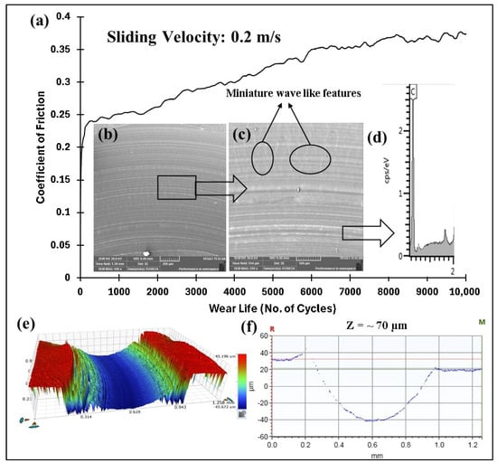 Pristine PEEK coating at a normal load of 70 N, including the (a) frictional graph and (b,c) SEM image, along with the (d) corresponding EDS scan, (e) 3D optical scan, and (f) 2D optical scan of the wear track.