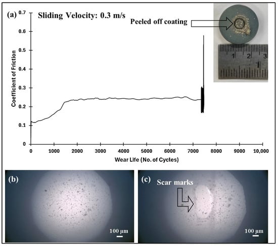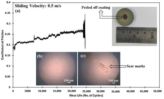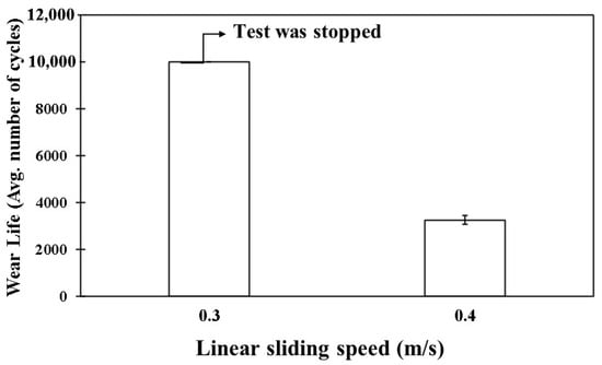 As the sliding speed is increased, the relative motion between the coating and the counterface medium intensifies, resulting in increased frictional forces and contact stresses at the interface, leading to a considerable generation of heat and increased localized temperatures at the interface. Hence, the coating failure must have resulted from the reduction in the mechanical properties as a result of the degrading of the coating at these elevated temperatures, signifying the fact that 0.5 wt% of ceria was insufficient to provide the necessary reinforcement to the coating at an increased speed of 0.4 m/s. The comparative wear life of PEEK/0.5 wt% ceria coating is shown in Figure 13.
