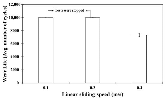 Wear life comparison for pristine PEEK coatings under a normal load of 70 N over 10,000 cycles at varying sliding speeds.