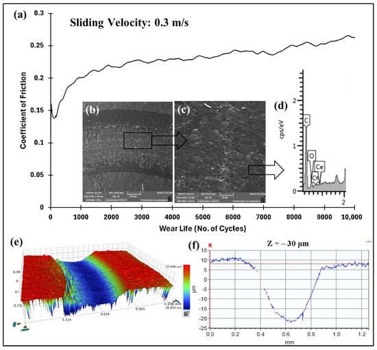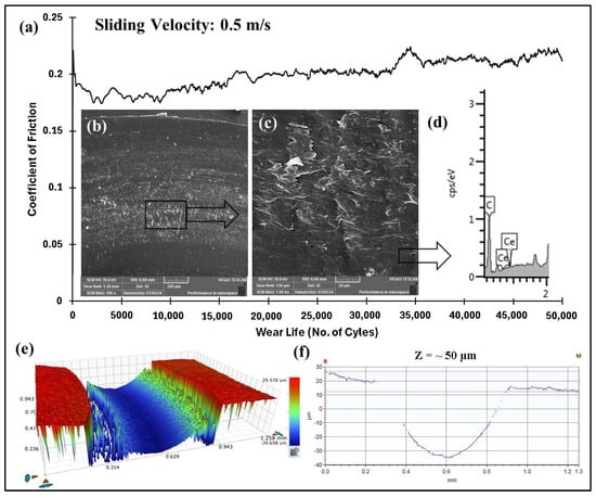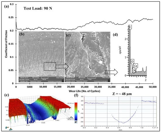 PEEK/1.5 wt% ceria coating at a normal load of 70 N, including the (a) frictional graph (b,c) and SEM images, along with the (d) corresponding EDS scan, (e) 3D optical scan, and (f) 2D optical scan of the wear track for 50,000 cycles.