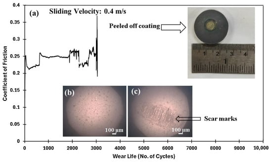 After testing the pristine PEEK coatings, which failed at 70 N load and 0.3 m/s sliding speed, nanocomposite coatings with ceria loadings of 0.5, 1.5, and 3 wt% were developed, and their tribological properties were assessed under these conditions. As illustrated in Figure 11f, incorporating ceria enhanced the resistance to wear properties of the PEEK coating. Under the same load and sliding speed, the wear track depth reduces to ~30 µm, in contrast to the ~70 µm observed for the pristine PEEK coating. These enhancements can be attributed to the increased hardness of the coating achieved by incorporating 0.5 wt% ceria. However, at 70 N and 0.4 m/s, the PEEK/0.5 wt% ceria coating failed ~3100 cycles, as illustrated in Figure 12.