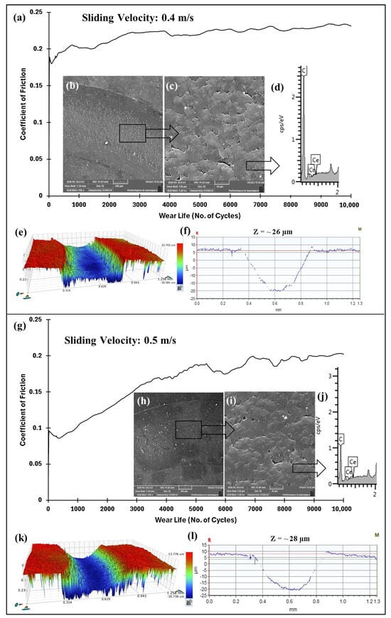 (a,g) Frictional graphs of PEEK/1.5 wt% ceria coatings, along with (b,c,h,i) SEM images with the corresponding (d,j) EDS scans, (e,k) 3D profile, and (f,l) wear track depth images of the wear track at varying sliding velocities for 10,000 cycles at 70 N.