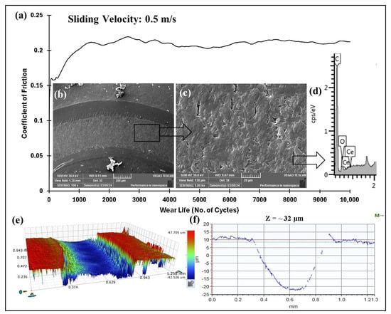 PEEK/0.5 wt% ceria coating at a normal load of 70 N, including the (a) frictional graph and (b,c) SEM image, along with the (d) corresponding EDS scan, (e) 3D optical scan, and (f) 2D optical scan of the wear track.
