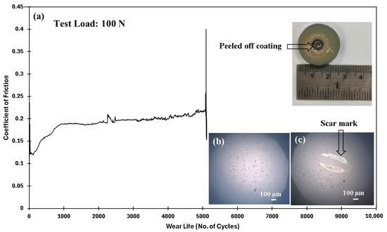 Pristine PEEK coating at a normal load of 70 N, including the (a) frictional graph, along with the peeled-off coating with the (b) ball image before and (c) after testing with acetone cleaning.