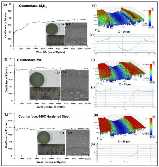 The wear tests were conducted at room temperature using a ball-on-disc setup on a UMT-3 tribometer (Bruker, USA). A 6.3 mm diameter alumina ball served as the counterface, which was cleaned with acetone and dried using an air blower prior to the testing. To examine the formation of any transfer film or scratches, the counterface ball was inspected using an optical microscope (MT7000, Meiji, Japan), both before and after the experiment. To investigate how various counterface materials influence the tribological properties, three additional balls—silicon nitride (Si3N4), tungsten carbide (WC), and 440C hardened steel (SS), with similar specifications to the alumina ball—were used. Each sample underwent three sets of tests, and the average values for the wear life and COF were presented.