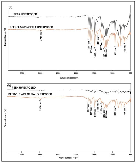 The FTIR wide spectra from 4000 to 500 cm−1 for pristine PEEK and PEEK/1.5 wt% ceria nanocomposite coatings, unexposed and exposed to UV radiation, are shown in Figure 24a and b, respectively. As can be observed from Figure 24a, the FTIR spectra of the unexposed pristine PEEK exhibited a C=C stretching at 1647 cm−1 and a vibration of the skeletal ring at 1594 cm−1, 1487 cm−1, and 1411 cm−1, respectively [56,57,58]. The peak at around 1154 cm−1 corresponds to C-O-C stretching [59]. The vibration bands of the diphenyl ether group’s asymmetric stretching were observed at 1277 cm−1 and 1185 cm−1 [60]. The absorbance observed at 835 cm−1 and 766 cm−1 correlates with the C-H out-of-plane bending vibrations [61]. Furthermore, the FTIR spectrum of the unexposed PEEK/1.5 wt% ceria consisted of the signature peak of ceria at 2924 cm−1, corresponding to −CH3 and −CH2 asymmetric stretching [62], in addition to all the signature peaks of PEEK. However, after exposing the coatings to UV radiation (Figure 24b), the intensity of the peaks of PEEK matrix drastically reduced, suggesting a significant degradation of PEEK after UV exposure [63,64]. Furthermore, the FTIR spectrum of the UV-exposed PEEK/1.5 wt% ceria composite coating showed all the signature peaks of PEEK and ceria at similar positions as the unexposed sample. Even though the peak intensities exhibited by the UV-exposed PEEK/1.5 wt% ceria composite coating were reduced, their intensities were much higher compared to the UV-exposed pristine PEEK coatings, suggesting that the composite coating showed better resistance to degradation on UV exposure [65,66,67]. This was because the ceria nanoparticles exhibit a fluorite-type lattice with a high density of oxygen vacancies, which facilitates the strong absorption of UV light, particularly in the UVA (320–400 nm) and UVB (280–320 nm) regions, by enabling electronic transitions between Ce4+ and Ce3+ oxidation states [36]. This absorption reduces the penetration of harmful UV radiation into the polymer matrix, thereby preventing photodegradation of the host material. In addition to their UV-shielding effect, ceria nanoparticles serve as potent antioxidants. They exhibit reversible redox behavior, switching between Ce4+ and Ce3+ states in response to oxidative environments [32]. This redox cycling enables ceria to neutralize free radicals and reactive oxygen species, which are commonly generated under UV exposure and are responsible for polymer chain scission and oxidation [68].