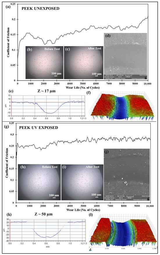 Comparison of the (a,g) frictional graph of PEEK coatings, along with the (b,h) before test ball and (c,i) after test ball images, with the (d,j) SEM images and the corresponding (e,k) 2D profile and (f,l) 3D profile wear track depth images at a normal load of 50 N at 0.1 m/s for 10,000 cycles.