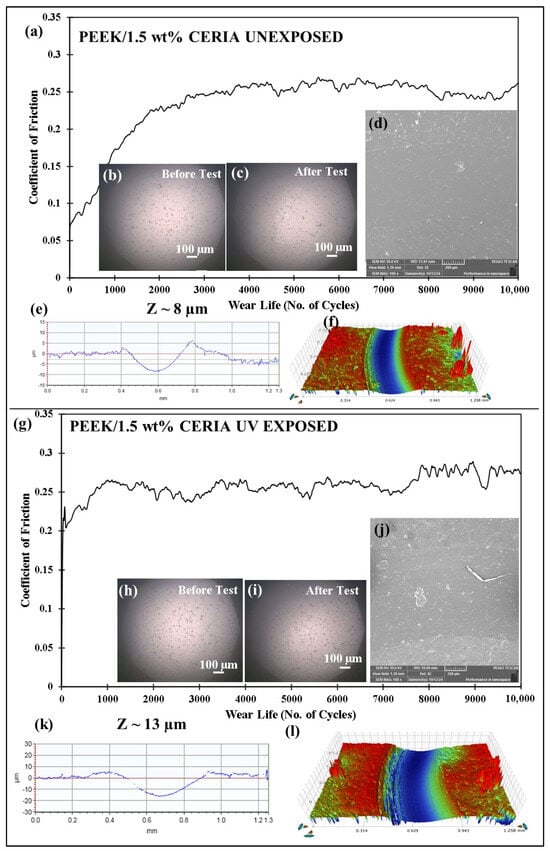 Wear tests are conducted on pristine PEEK and PEEK/1.5 wt% ceria composite coatings before and after UV exposure to evaluate their wear performance. The tribological tests are performed at 50 N load and 0.1 m/s sliding speed for 10,000 cycles, corresponding to a total sliding distance of 189 m. The results indicate that the unexposed pristine PEEK coating exhibited a moderate wear depth of ~17 µm (Figure 25e), as compared to a significantly higher wear depth of ~50 µm (Figure 25k) after UV exposure. This is attributed to the degradation of the PEEK polymer structure due to exposure to the UV radiation, as suggested by the FTIR spectrum (Figure 24b). The PEEK/1.5 wt% ceria nanocomposite coatings show significantly better wear resistance than pristine PEEK, exhibiting much lower wear depth in both UV-unexposed and UV-exposed conditions. The unexposed nanocomposite coating exhibited a wear depth of only ~8 µm (Figure 26e), and the UV-exposed composite coating demonstrated a wear depth of ~13 µm only (Figure 26k). The improved performance of the composite coating is primarily due to the enhancement of PEEK’s overall mechanical and thermal properties, as well as its UV resistance, achieved through the addition of ceria nanoparticles. This highlights the advantages of incorporating ceria to improve the wear durability and UV stability of PEEK.