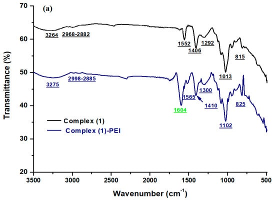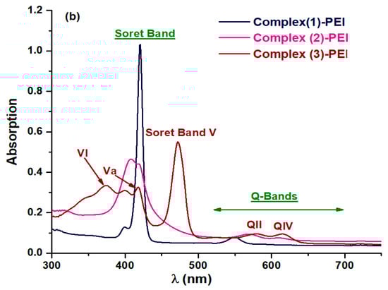 Spectroscopic data of: (a); complexes (1–3) and (b); complex (1)-PEI, complex (2)-PEI, and complex (3)-PEI in dichloromethane.