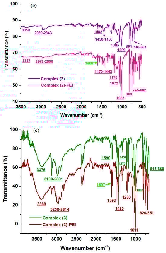FT-IR spectra of (a) complex (1) and complex (1)-PEI, (b) complex (2) and complex (2)-PEI, (c) complex (3) and complex (3)-PEI.