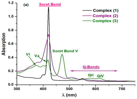 The UV-visible spectra of the complexes (1–3) and the modified complexes were studied in dichloromethane at a concentration of ca 10−6 M. Figure 2 elucidates the spectroscopic data of complex (1–3) and the modified ones. As observed, the change in the spectral profile is due to the presence of Zn, Fe, and Mn metals. We noticed that the spectrum of complex (1) exhibits a very intense band known as the Soret band, allowing the transition of the electrons from the ground state S0 to the second excited state S2 at 422 nm. In addition, two less intense absorption bands are observed at 550 nm and 596 nm, which are known as Q-Bands corresponding to the transition of electrons from the ground state to the first excited state S1 [30,31,34]. Regarding complex (2), the UV-vis spectrum reveals the presence of a Soret band at 421 nm and one Q-band at 510 nm [35]. We observe significant changes for complex (3) compared to complex (1) and (2). This is related to the manganese metal [36]. Complex (3) contains a hypertype electronic spectrum that includes a half-vacant metal orbital with symmetry, such as [dπ:dxz and dyz] [36]. The Soret band V, or the strongest band, is identified at 471 nm. This band results from the transfer of the porphyrin’s a1u(π) and a2u(π) orbitals to manganese orbitals, such as [dπ: dxz and dyz]. The two less intense bands than the Soret band, the VI and Va bands, are detected at 372 nm and 408 nm, respectively. In addition, there are two Q-bands, the QII and QIV bands, observed at 577 nm and 615 nm, respectively. After chemical modification of the complexes (1–3) with polyethyleneimine, we observe a slight bathochromic shift in the values of λmax of the bands. This suggests the interaction of complexes (1–3) with the polyethyleneimine polymer.